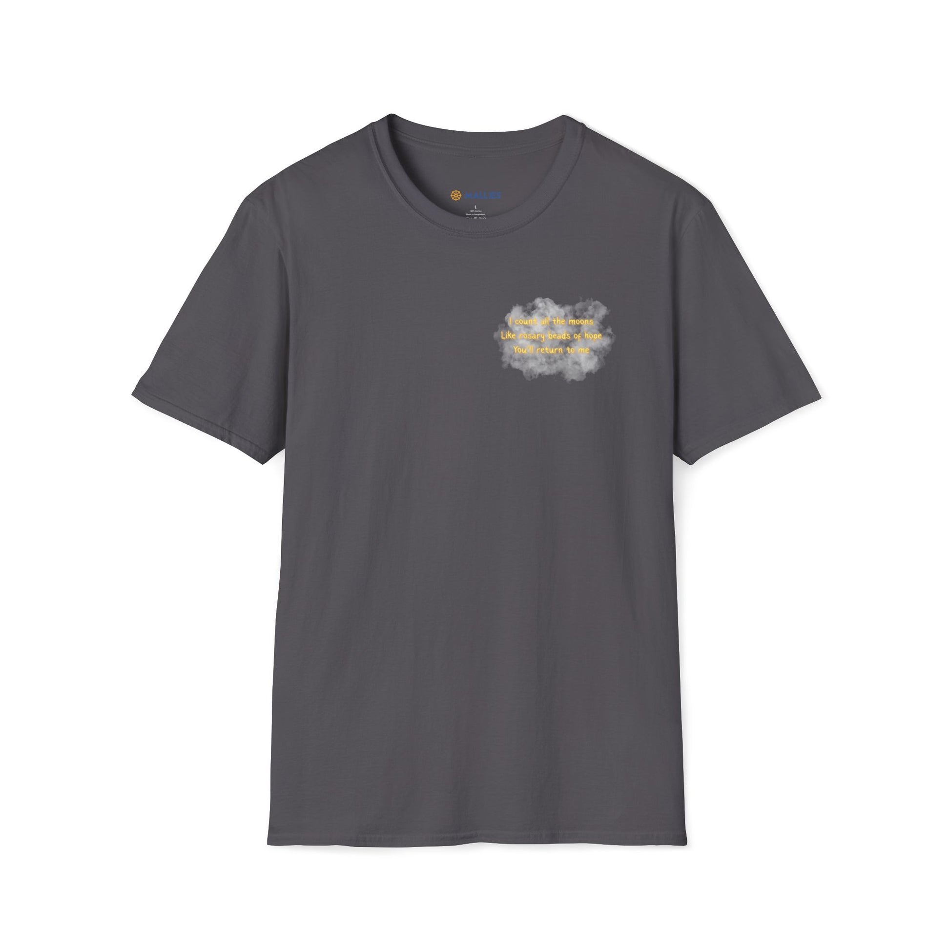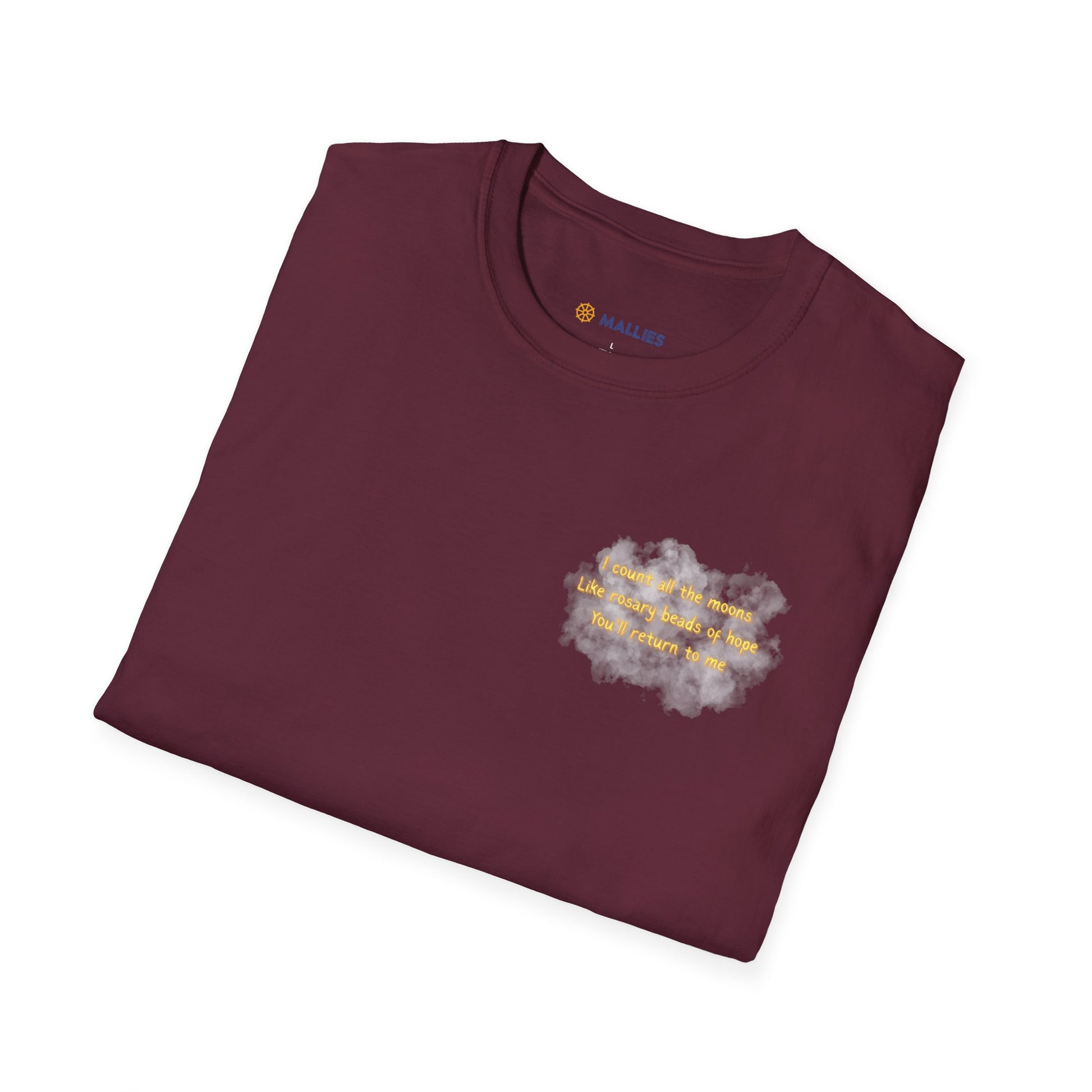 A cozy blend of astronomy and poetry, this shirt features a dreamy hand-painted moon phase illustration on the back, complete with twinkling stars against a midnight sky. The front displays an original haiku about counting moons like rosary beads of hope, rendered in soft golden lettering. Perfect for stargazers, poetry lovers, or anyone who finds comfort in celestial cycles and the promise of return.